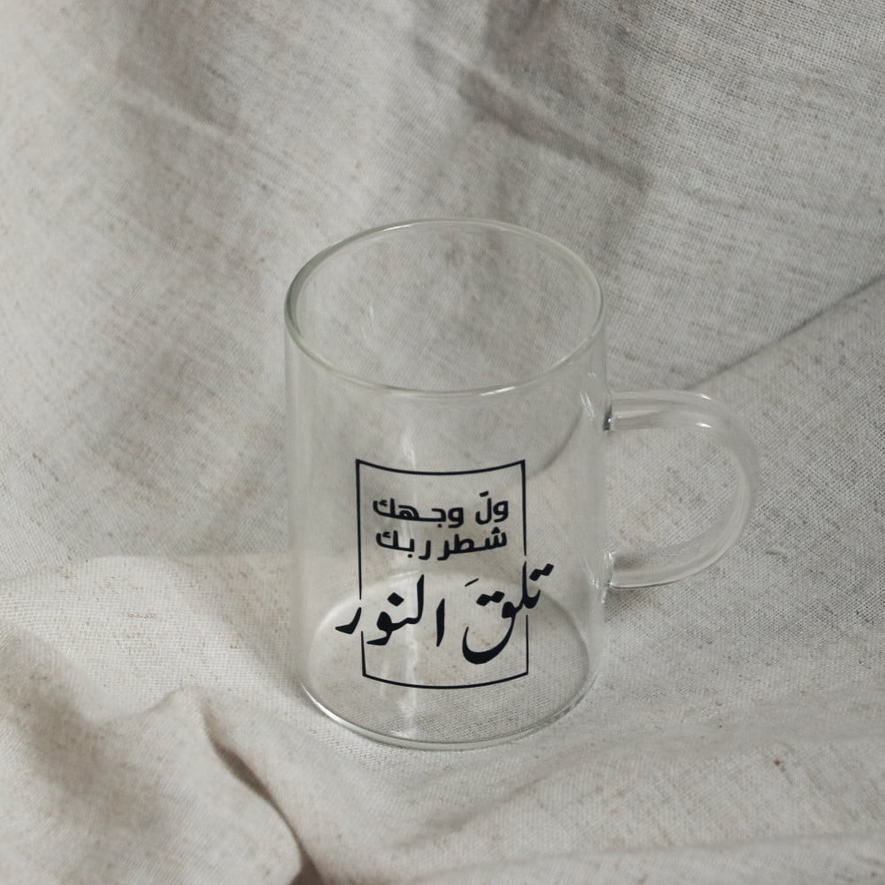 كوب زجاجي أنيق بعبارة " ولّ وجهك شطر ربّك ، تلقَ النور " مطبوع يدويًا يشارككم أيامكم!🤍